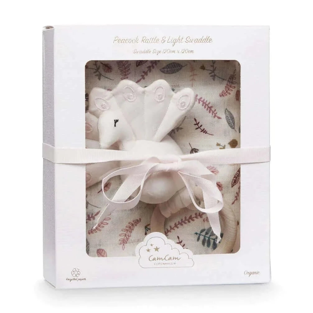 清新典雅的芽葉玫瑰印花有機棉嬰兒包巾,搭配具有沈穩木球聲響的孔雀造型搖鈴,最能引起寶寶的視覺與聽覺感官刺激,且能夠安撫焦慮的情緒,這款禮盒是送給新生兒的完美禮物。