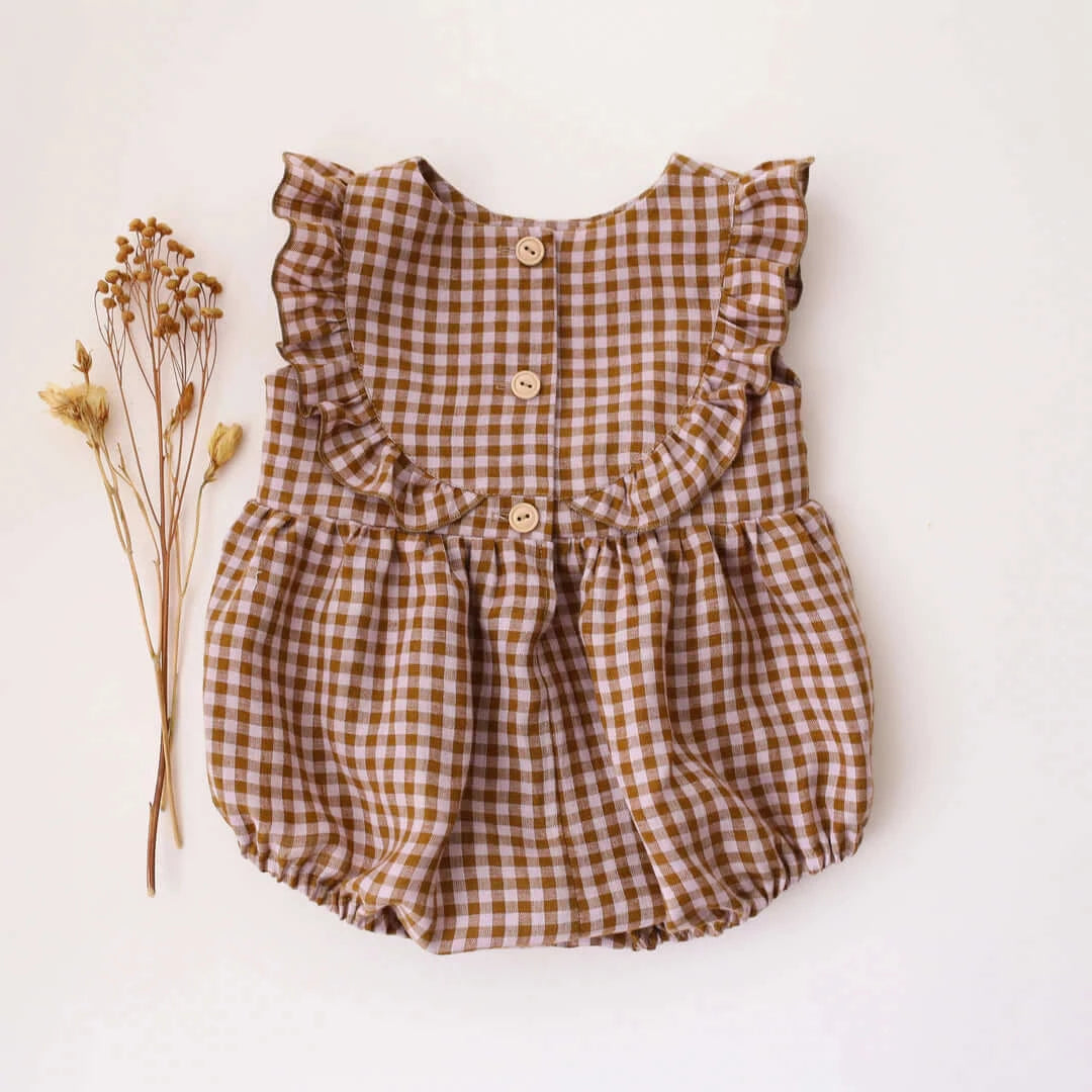 手工製衣,甜美泡泡連身衣,帶荷葉邊衣身,褲腿有彈性,背面有木質鈕扣,胯部有按扣,方便穿脫。