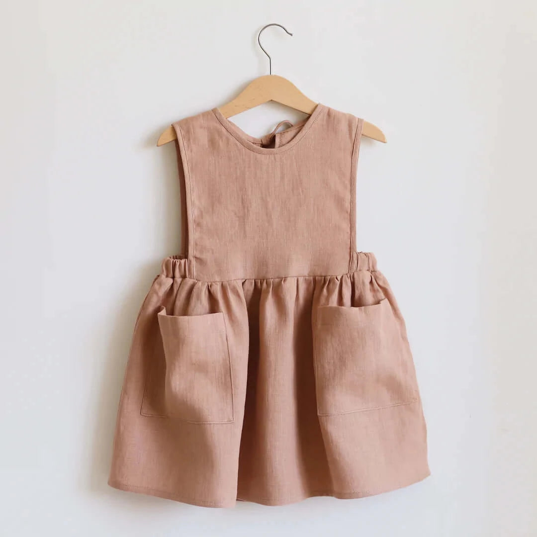 手工製衣,漂亮的圍裙式連身裙,背面繫帶,側袋和簡單的裙子。