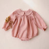 甜美泡泡連身衣,帶娃娃裝緊身胸衣,彼得潘領,全長縮褶袖,飾有褶邊細節,褲腿有彈性,背面有木質鈕扣,胯部有按扣,便於更換。