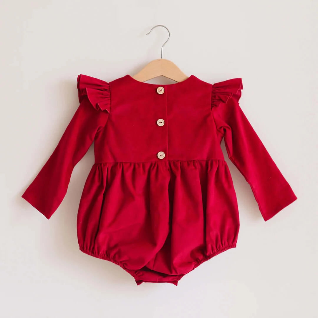 甜美泡泡連身衣,飄飄長袖,褲腿有彈性,背面有木質鈕扣,胯部有按扣,便於更換。