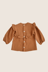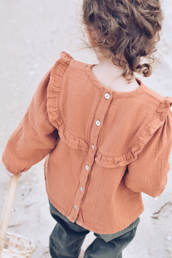 100% cotton muslin blouse with ruffled details, and mother-of-pearl buttons at the back.