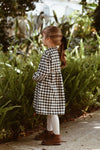 經典百搭黑白格紋立領連衣裙,正面飾有木質鈕扣。 非常適合秋冬季節。