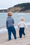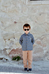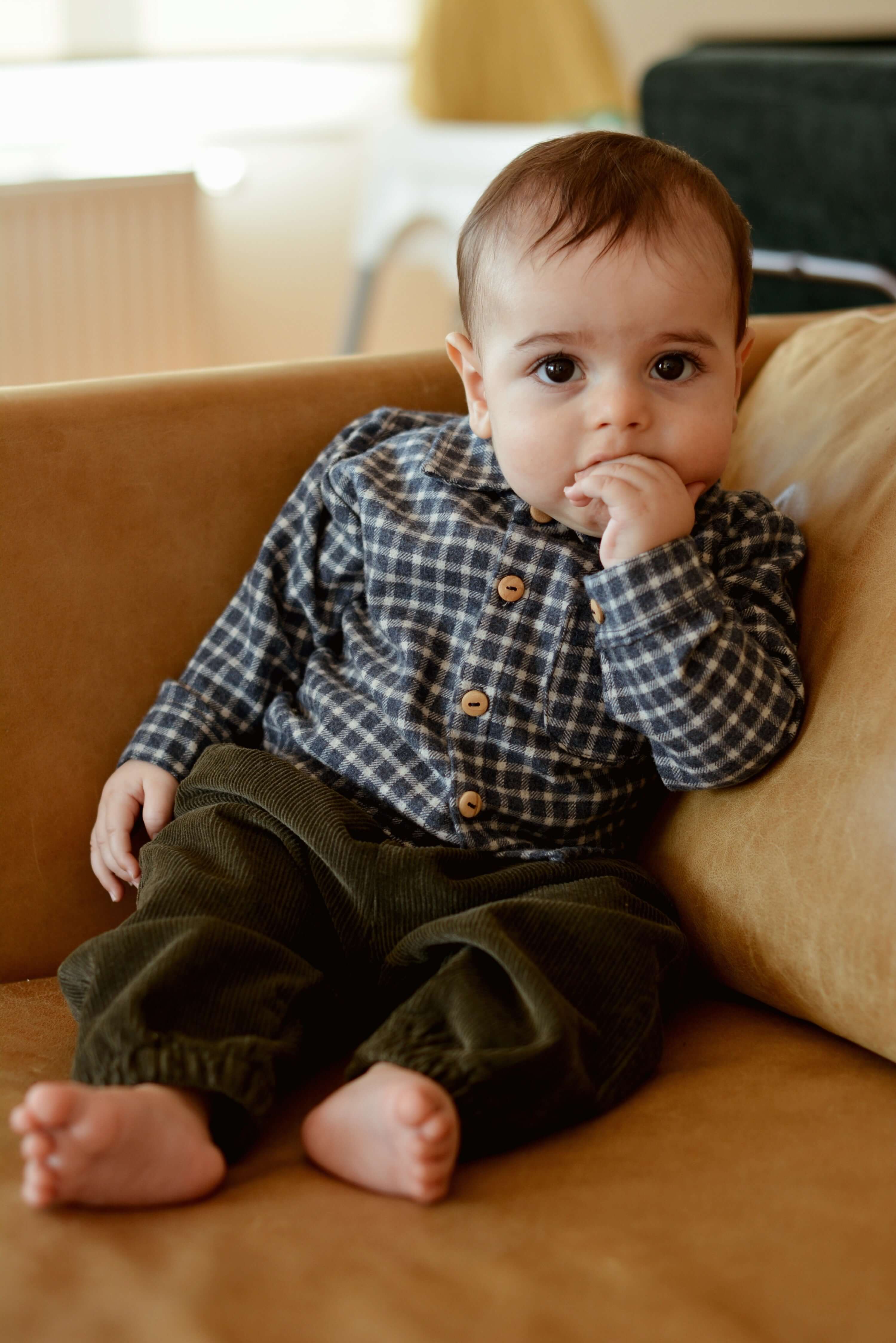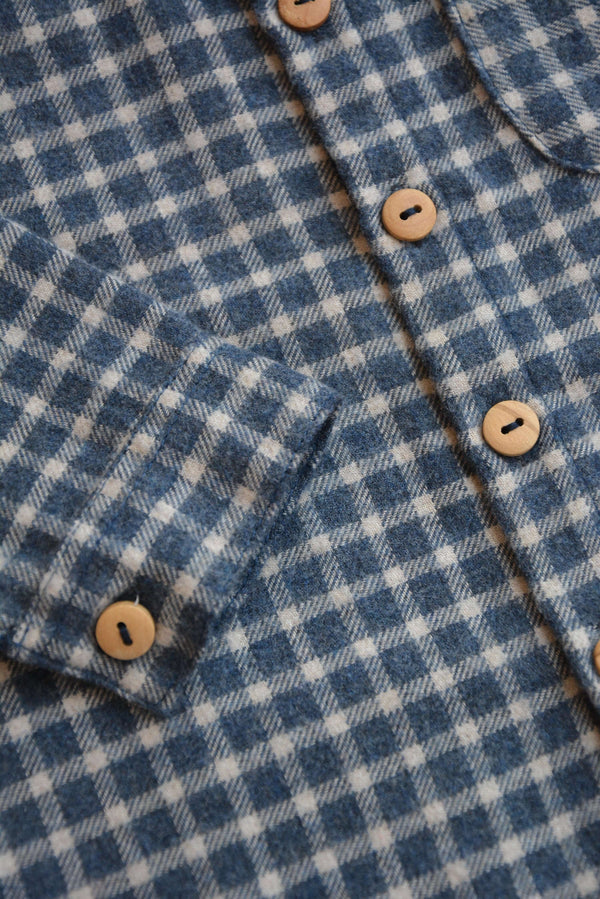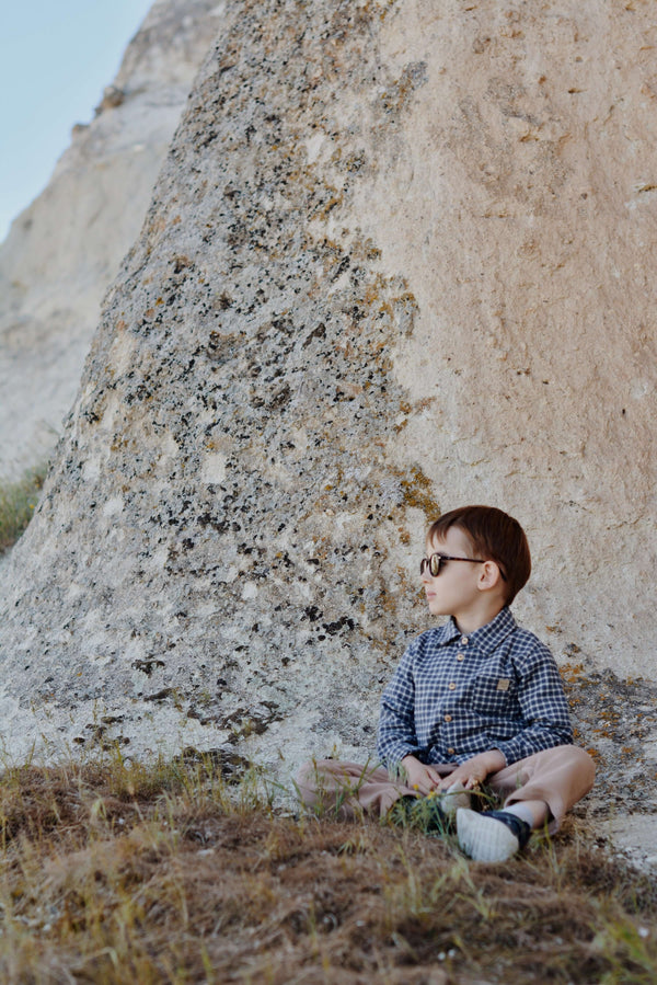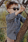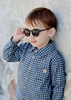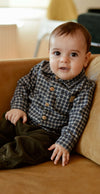 經典格紋帶有木質鈕扣的柔軟襯衫,縫上皮製質感 Eli & Nev 品牌字樣於胸前口袋衣角,給男寶寶和小男孩的紳士百搭襯衫!