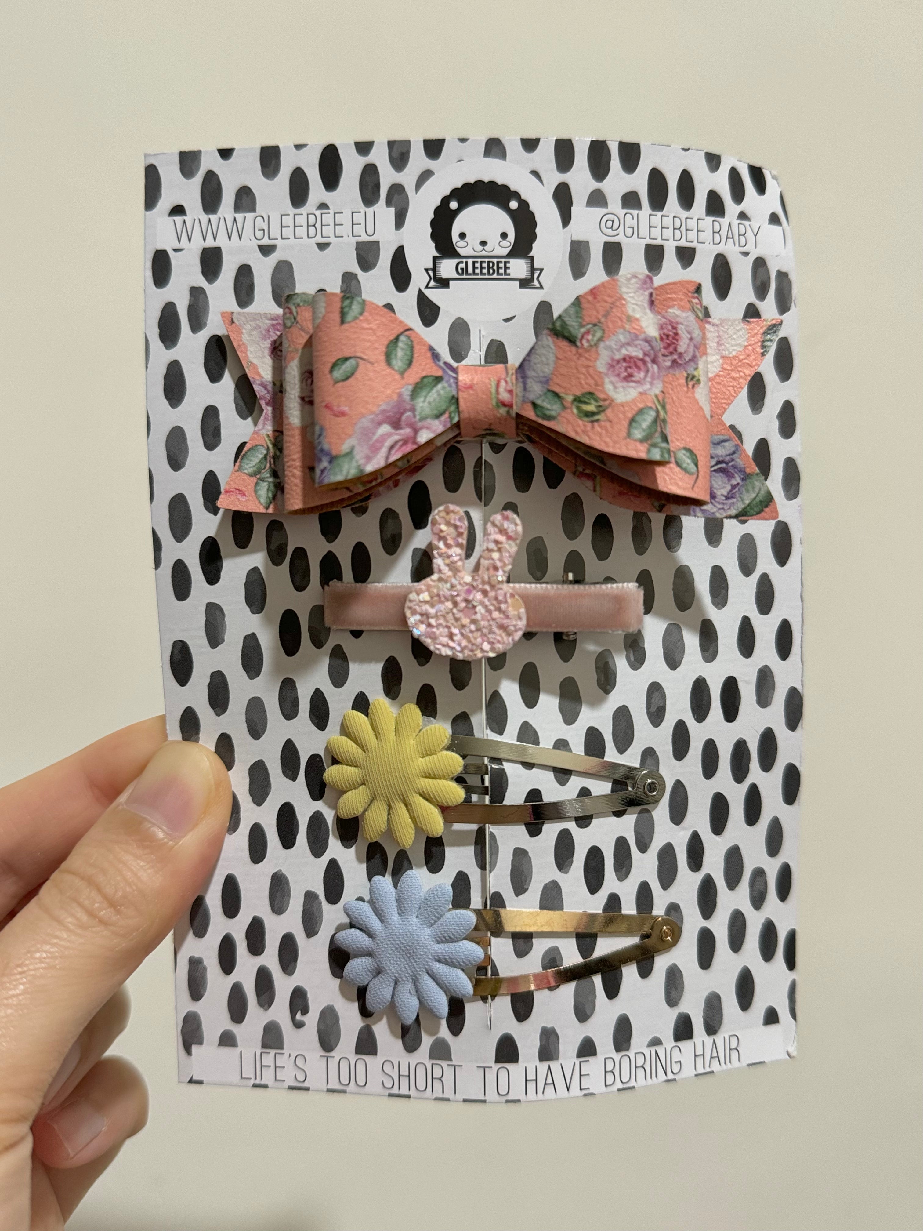 • 蝴蝶結 8.3cm ; 兔子 4.5cm ;小花(粉色已售罄,實品可選鵝黃色 or 綠色 + 天藍色) 5cm