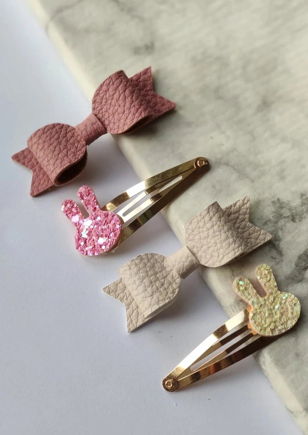 • 夾子類型:2 x 3 公分鱷魚夾(蝴蝶結)和 2 x 5 公分金色按扣夾(兔子)