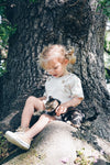 男女皆宜 OEKO-TEX 認證 100% 純棉米色 T-shirt,有溫暖小太陽圖案,左肩部有兩顆椰子木排釦,親膚透氣舒適,椰木鈕扣,好搭配適合春夏的日常。